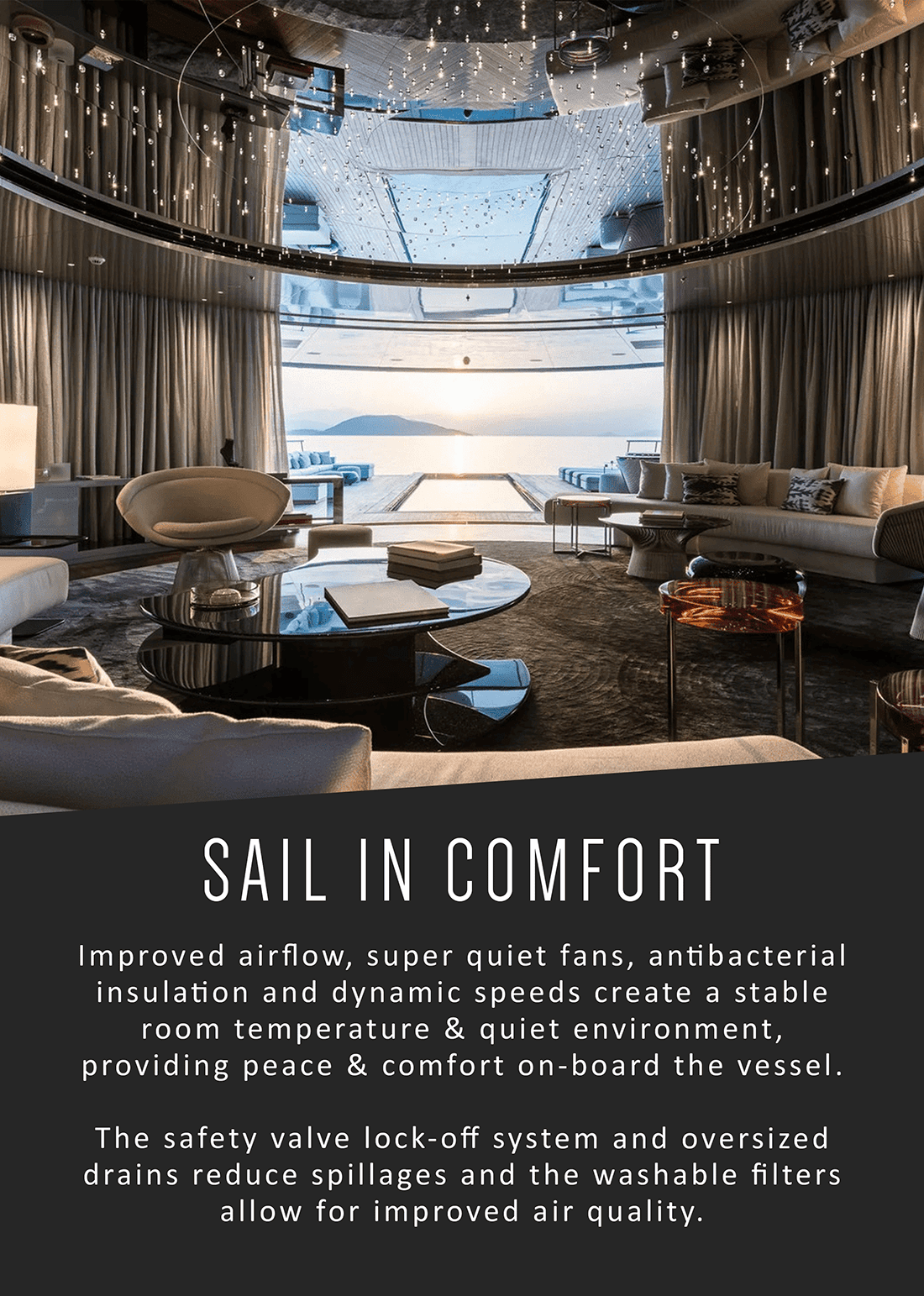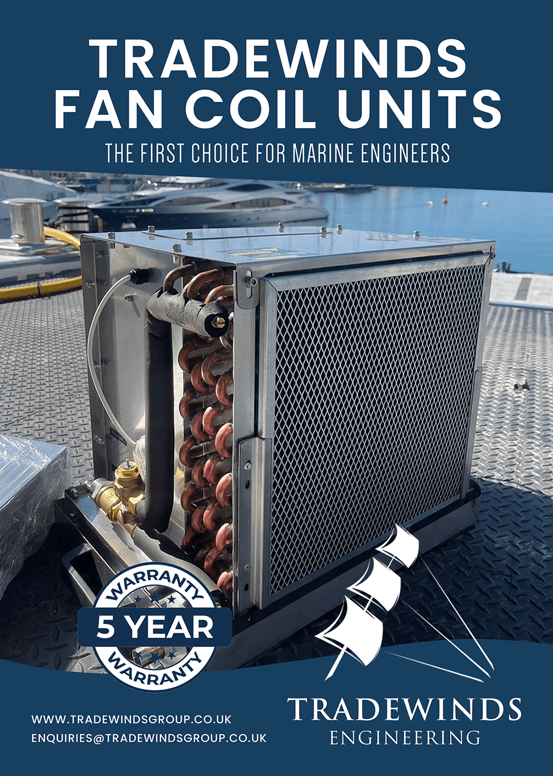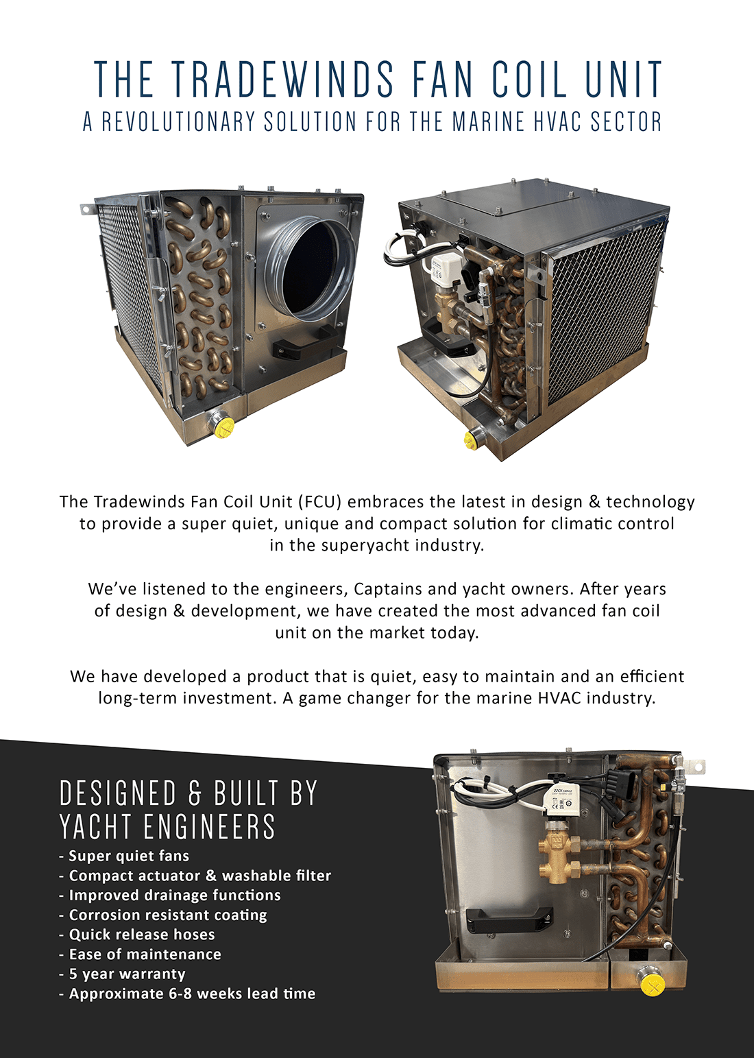 Tradewinds’ Fan Coil Units embrace the latest design and technology to provide a super quiet and compact solution for climatic control in the superyacht industry. We’ve listened to the engineers, captains, owners and after years of design development have come up with what we believe to be the most advanced fan coil unit on the market.