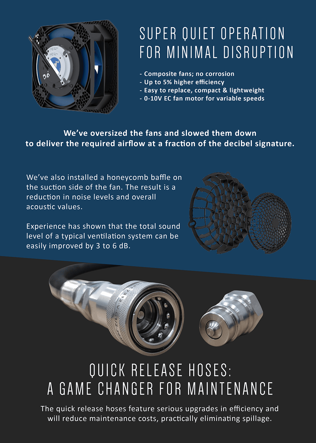 We’ve oversized the fans, then slowed them down to deliver the required airflow at a fraction of the decibel signature. We’ve also installed a honeycomb baffle on the suction side of the fan. This lowers the decibels by up to 6dB.